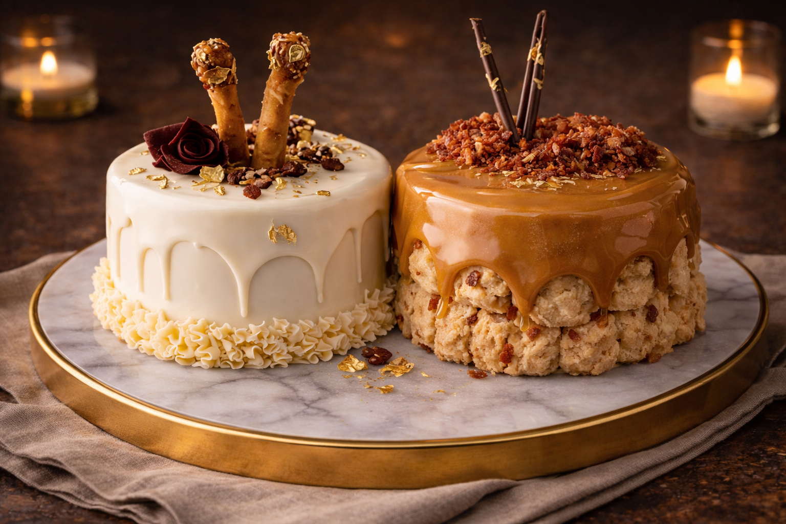 Our Barkday Cake is a hand-crafted cinnamon apple celebration cake, finished with a slow-poured, silky peanut-butter glaze. Each cake is topped with golden peanut brittle and signature steak-and-cheese, carob-dipped candles, then delicately rolled in our rainbow crunch for a festive finish.Blending playful elegance with clean, wholesome ingredients, this whimsical Barkery-style cake is designed for four-legged family members who celebrate in style.