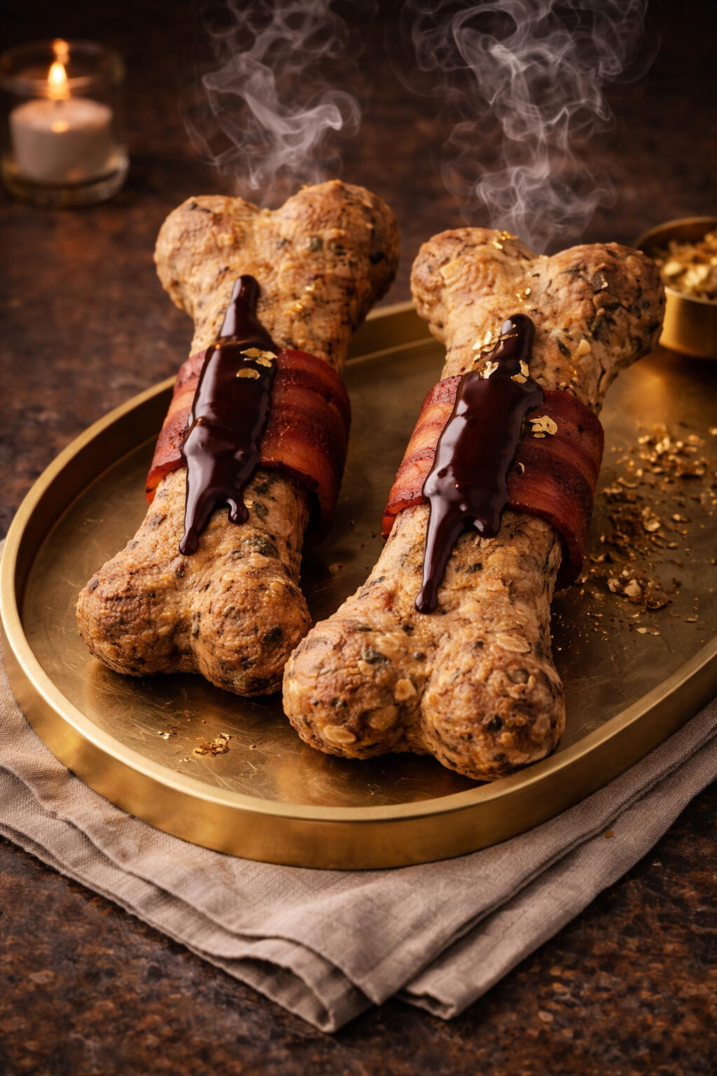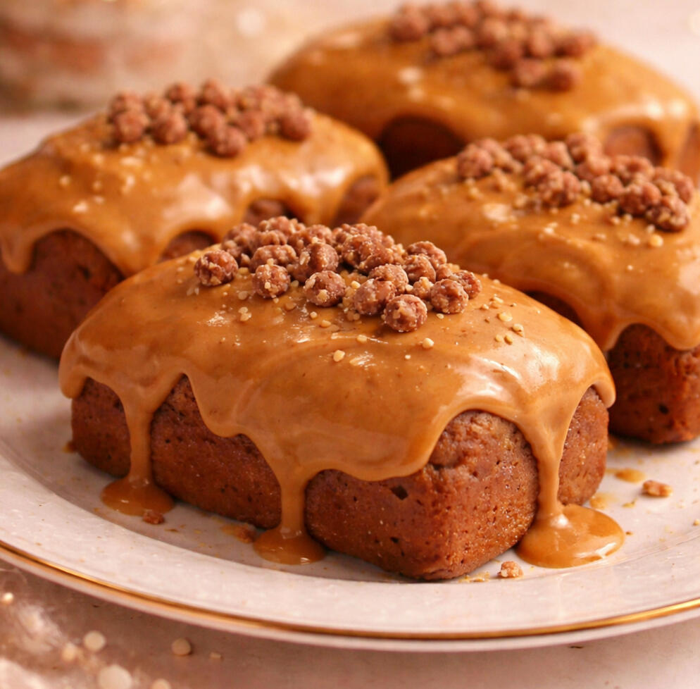 A soft, slow-baked banana bread loaf, finished with a warm, silky peanut-butter glaze, delicate carob drizzle, and apple crumble for the perfect hint of crunch. Each loaf is plated with an artisanal flair — a touch of edible elegance.Made in limited batches with clean, dog-safe ingredients.